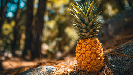A ripe pineapple sitting on a rock in a forest with blurred trees in the background.
