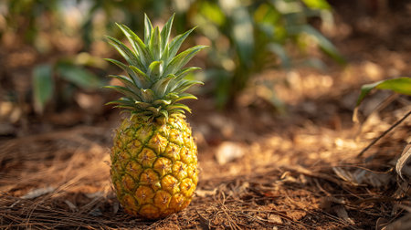 A ripe pineapple grows in a tropical field with green leaves and brown soil