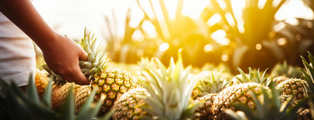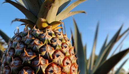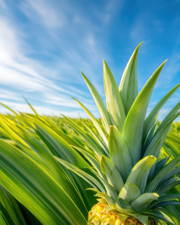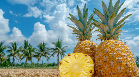 Bright and vibrant scene featuring fresh pineapples against a beautiful sky. Perfect for summer themes, healthy eating, and tropical landscapes.