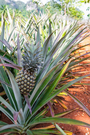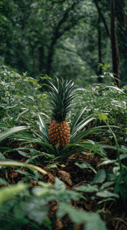 A ripe pineapple grows on a plant in a lush tropical plantation. The vibrant colors and natural beauty of the scene are captivating.