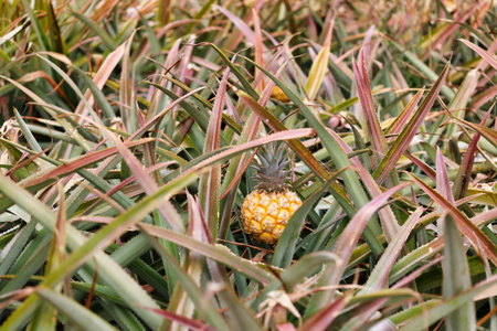 A single pineapple stands prominently amidst vibrant green foliage in a natural outdoor setting. The image showcases the fruit with its textured skin and spiky crown, complemented by the surrounding lush plants. The composition employs natural lighting creating a visually appealing image suitable for various commercial applications.