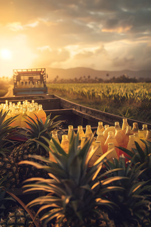 Cargo truck carrying bottles with pineapple juice in an orchard with sunset. Concept of food and drink production, transportation, cargo and shipping.