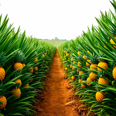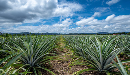 A pineapple plantation with rows of pineapples growing under the sun, their spiky green leaves contrasting against the rich soil and blue sky.