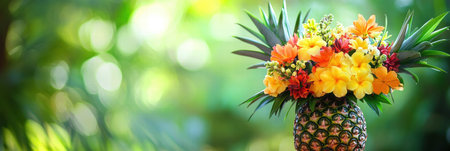 A pineapple is beautifully decorated with vivid flowers and lush green leaves in a bright and sunny tropical environment.