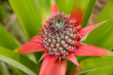 Pineapple flowers on young pineapple fruit with pineapple leaves