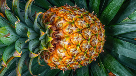A close-up captures a ripe pineapple with vibrant orange hues against a backdrop of green leaves. The composition is detailed with natural lighting. This image could be used for commercial projects, food-related articles, or design applications. The focus is on the fruit's texture.