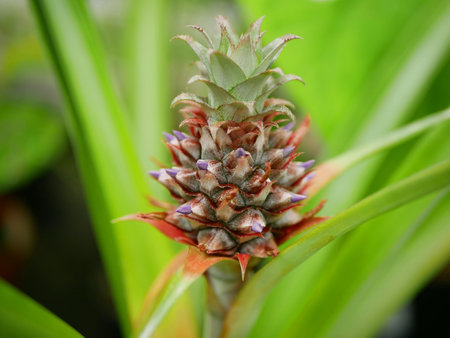 blooming pineapple with small purple flowers close-up in Sri Lanka. Exotic travel and vegetarian nutrition concept