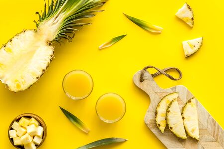 Make pineapple juice. Glasses near sliced fruits on yellow background top-down.