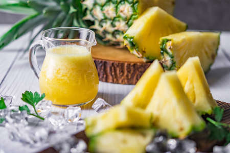 Fresh and cold pineapple drink among triangular piece of pineapple