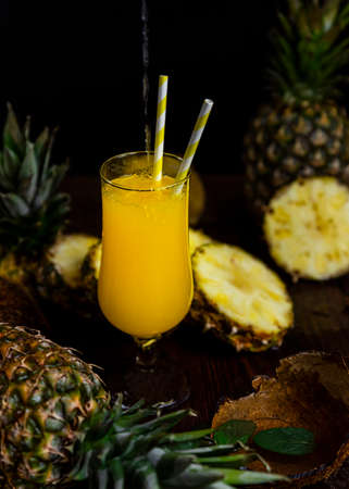 Pineapple cocktail or juice with ice and pineapples on a dark background, Wooden board with fresh sliced pineapple on table