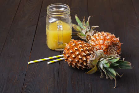 Pineapple juice on a wooden background. A glass jar with juice
