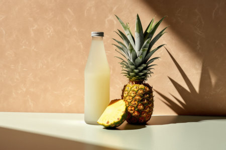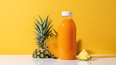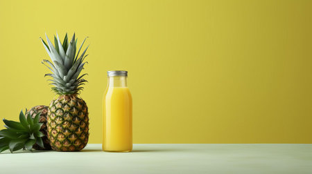 pineapple juice served in a glass and bottle, set against a white concrete background adorned with fresh pineapple fruits, epitomizing the concept of a tropical fruit drink
