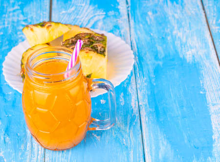 Pineapple and pineapple juice on the blue board background