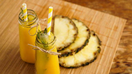 Fresh made Pineapple Juice with Ice in a small glass bottle on wooden background. Homemade drink.