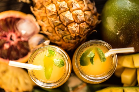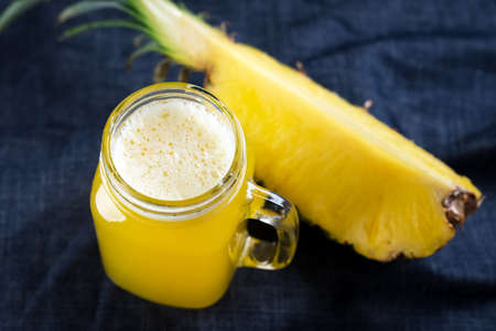 Tropical pineapple smoothie in a mason jar, selective focus.