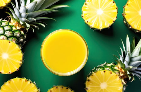 Bright and bold abstract of oil droplets floating on water, with pineapple slices adding a tropical, vibrant touch to the scene