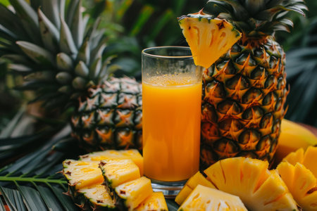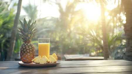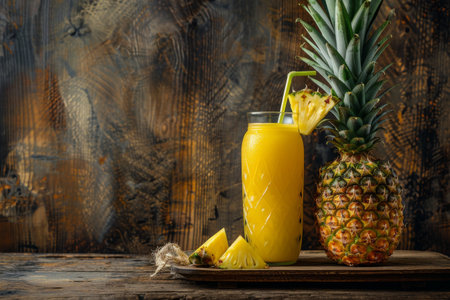 A vibrant pineapple next to a glass of fresh juice sits on a wooden table. This tropical scene captures the essence of summer and healthy living, perfect for food enthusiasts.
