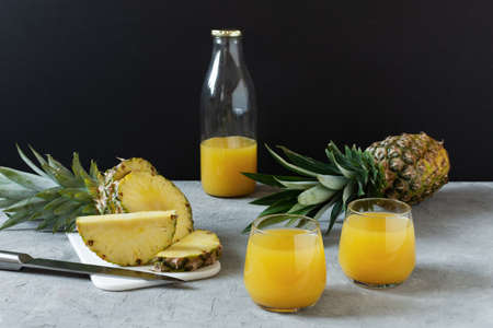 Pineapple fresh juice in glass on grey table over black background. Fresh vitamins pineapple juice.