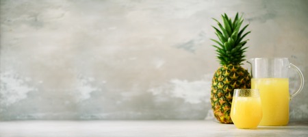Pineapple juice in glassware and whole pineapple fruit on gray background. Copy space, sunlight effect. Summer, holiday concept. Raw, vegan, vegetarian, clean eating diet. Banner