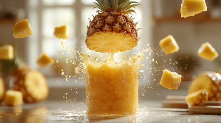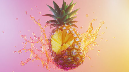 A stunning visual of a freshly cut pineapple splashing into water, showcasing vibrant colors and dynamic movement. Perfect for culinary or tropical themes.