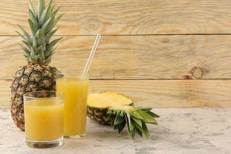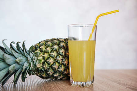 Freshly made pineapple juice on a wooden table. Place for text. Pineapple juice in a glass on a light background.