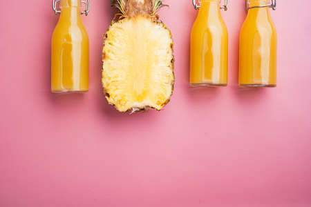 Large ripe fruit pineapple and pineapple juice on a bright yellow and pink background. summer. top view.