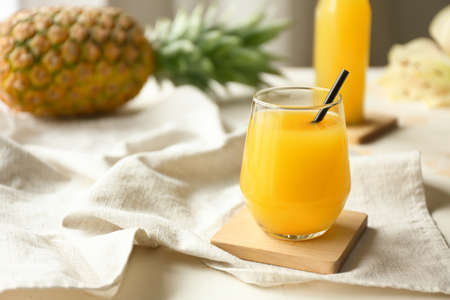 Glass of fresh pineapple juice on table