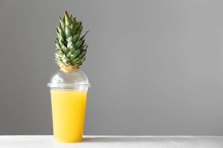 Pineapple juice in a plastic cup on yellow background. Tropical juice - summer banner