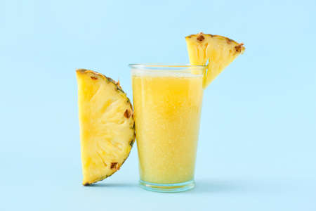 Pineapple juice or smoothies and pineapple slices on a blue background.