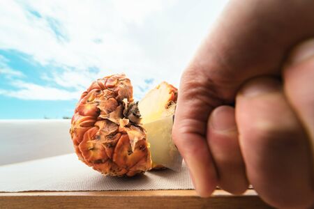 Man cutting pineapple - Close up male hand holding sharp knife preparing tropical fruits smoothies - People lifestyle and healthy exotic food concept