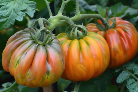 Vibrant heirloom tomatoes ripen on a lush vine in a garden setting