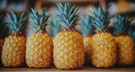 A cluster of ripe pineapples showcases their bright yellow skin and green tops, nestled among lush foliage under natural sunlight in a tropical environment.