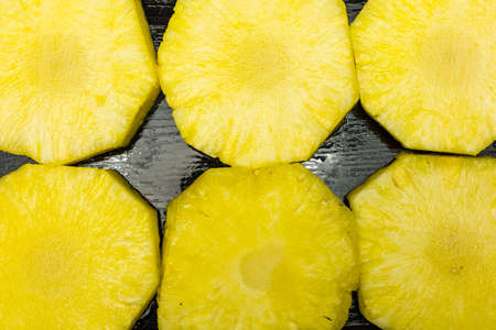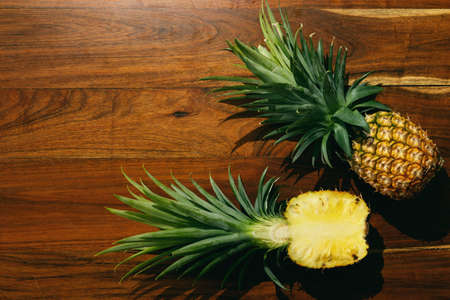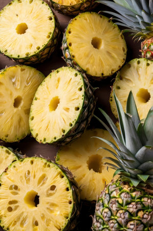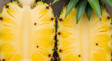 Overhead view of sliced ripe pineapple with vibrant yellow flesh and textured skin, ideal for healthy eating or tropical themed designs.