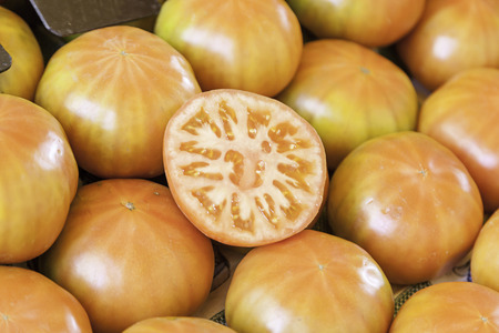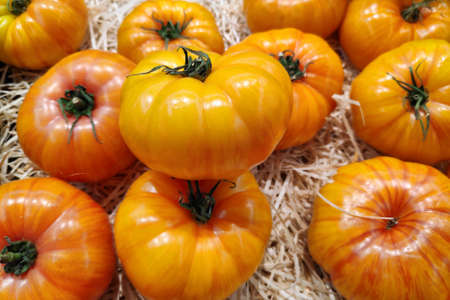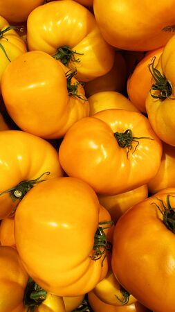Close-up on a stack of yellow heirloom tomatoes for sale on a market stall.