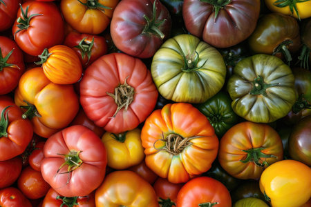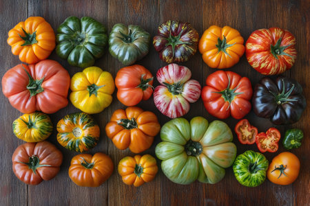 Heirloom tomatoes of various shapes and colors, laid out on a rustic table, showcasing their rich flavors and unique patterns