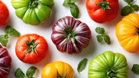 An array of vibrant fresh tomatoes in various colors, including green, red, purple, and yellow, artistically arranged with mint leaves, perfect for culinary inspiration.