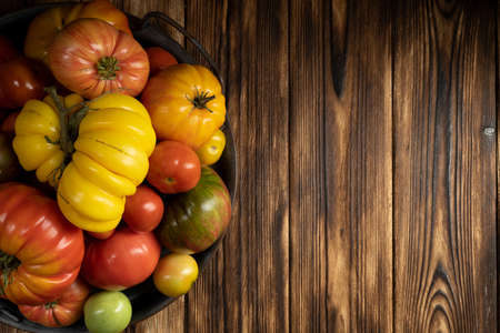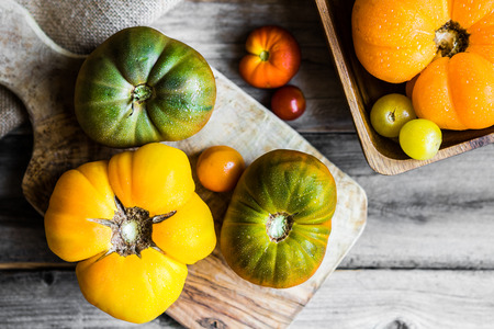 Colorful ripe red, yellow, orange and green tomatoes. Vintage wooden background
