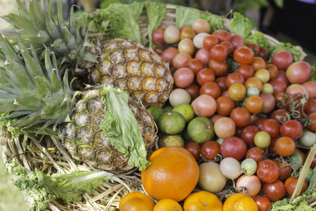A vibrant display of tropical fruits and vegetables ready to be grilled and enjoyed