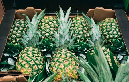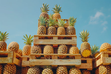 Fresh pineapples in woven baskets by beachside fruit stand warehouse under clear blue sky