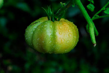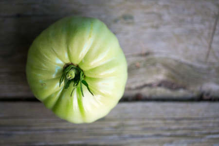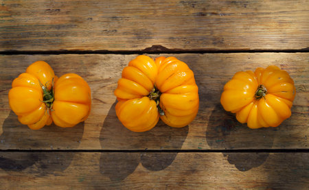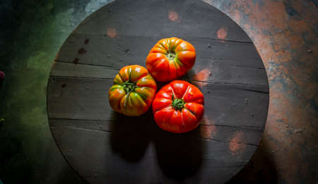 Raw ripe graden tomatoes on wooden background. Vegetarian ingredients, seasonal produce