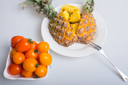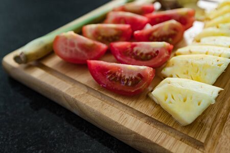 The combination of vegetables and fruits in the food. Cooking pineapples with tomatoes. A recipe for a delicious dish for quick cooking at home. Pineapple slices with tomatoes are ready for baking. Top view