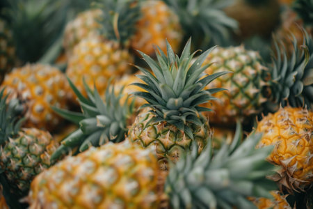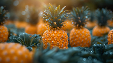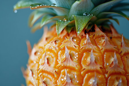 This close-up showcases a ripe pineapple adorned with glistening water drops, emphasizing its succulent and fresh appearance. The vibrant colors and textures highlight the fruit's natural beauty.