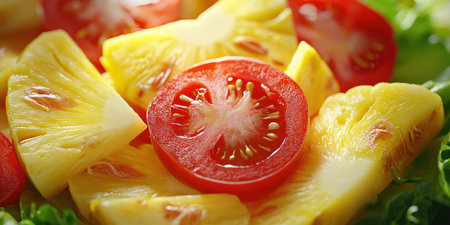 Fresh tropical salad with pineapple and tomato served on a bed of leafy greens in a bright and colorful setting