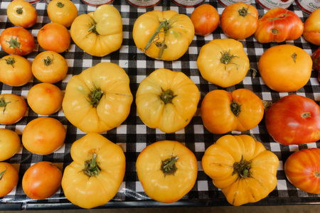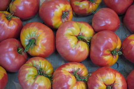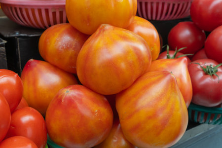 Mix of colorful heirloom tomatoes grown and harvested in Southern California and displayed at a farmers market.
