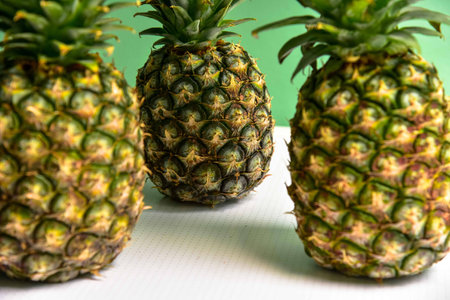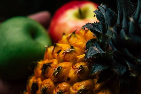 Closeup of a small pineapple and apple on nature background for healthy eating