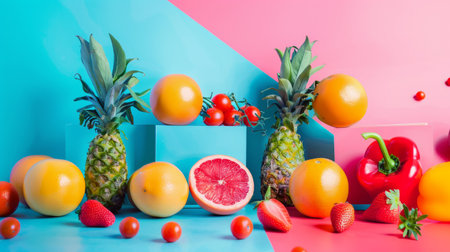 Colorful arrangement of fruits and vegetables on a pink and blue background, creating a fresh and vibrant scene full of natural produce.
