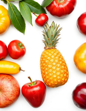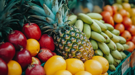 A colorful assortment of fresh fruits, including pineapples, apples, bananas, and citrus fruits, displayed at a market stall, symbolizing healthy eating and natural produce.