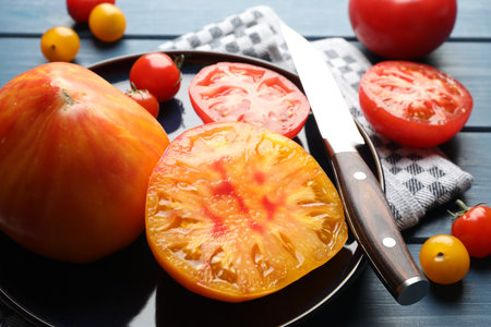 Different ripe tomatoes and knife on blue wooden table, closeup