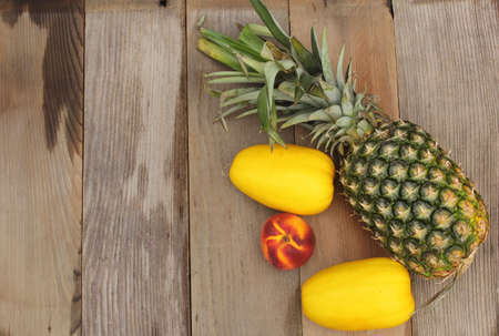 Sliced pineapple in a wooden boards and bowl with coconuts, peaches and citrus fruits close-up on a wooden grunge and picnic cloth background