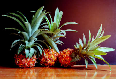 yellow mini pineapple on a gray background. Pineapple from Thailand. Flat lay. Copy space.